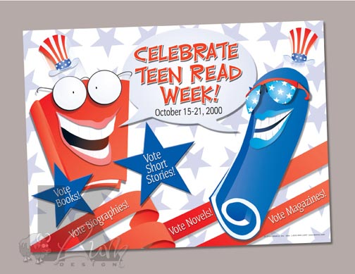A poster design and illustrations for a reading program during an election year where kids voted for either books or magazines.