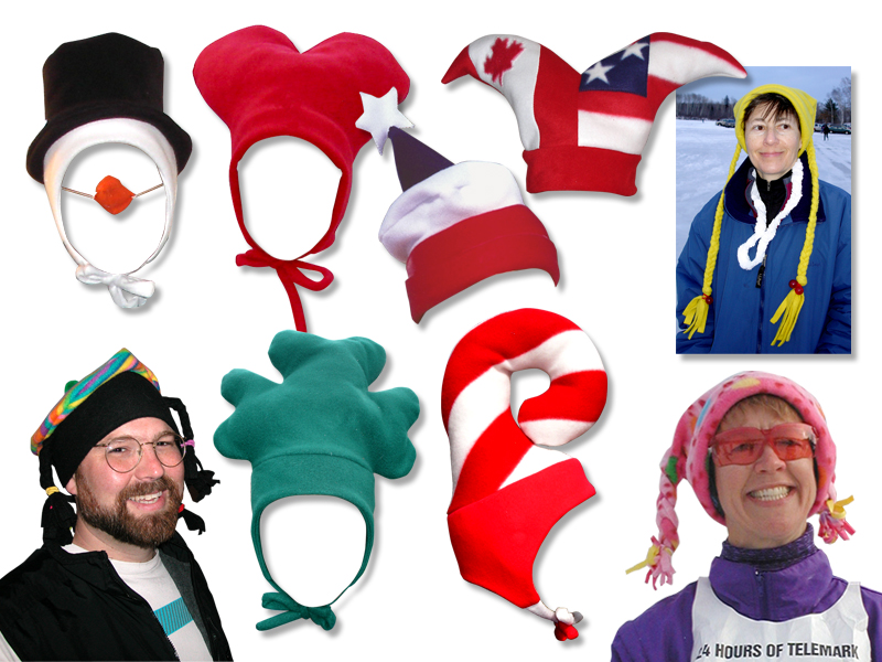 Polar Fleece hats! Great for ski events where fashion is more important than speed, or to keep you warm yet festive while Christmas Caroling, or while participating in a holiday parade, or just for the fun of it!